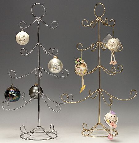 This beautiful set of four 24"High 4 tiered silver tone ornament display tree has 5" spacing between levels. Tree is 15" at its widest and base measures 10" wide. Holds up to 16 ornaments.
