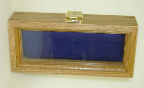This high-quality, solid wood, custom-made display case is ideal for showing off those expensive keepsakes. Perfect for pocket watches, coins, medals, knives, handguns or any other items you can think of. Shadow boxes come in two wood choices (oak, walnut). Case features a foam insert and comes with your choice of felt backing colors (blue, black, green, burgundy, or red). Features brass plated hinges and a locking latch. Comes in two depths (2 1/4" or 3 1/4"). Dimensions reflect outside measurements. Interior dimensions are 2 1/2" wide X 7 1/2" long x 1 1/4" OR 2 1/4" deep. These display cases are very nice quality and sure to please. Select wood, background and depth choices below.