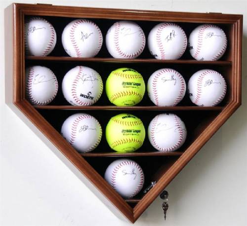 This remarkably affordable case is a great way to show off fourteen of your prized softballs. Case comes in oak, cherry, walnut, or black finish. Homeplate case features a locking acrylic door (with 98% U.V. protection and two keys) to keep out dust. Black felt background gives added contrast. Matching wood shelves come with indentations to hold the balls in place. Case measures 22" wide x 20" high x 4.75" deep. A great case for the money!!